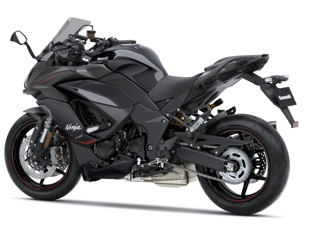 Estilização que destaca a imagem de família Ninja da Ninja 1100SX e potencial de condução desportiva apresenta carenagens de aparência aerodinâmica e um silenciador mono-lateral.