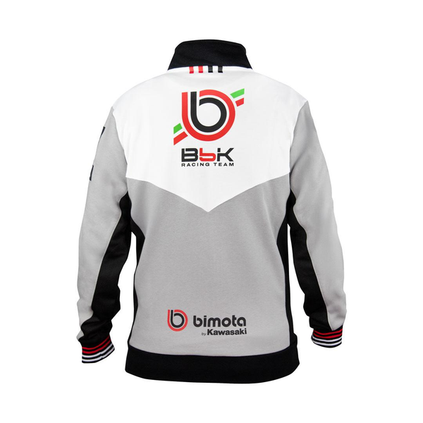 Uma camisola com fecho completo da marca Bimota/BbKRT em cinza, branco e preto, com gola alta, bolsos exteriores com fecho e punhos com faixas vermelhas e brancas. A cintura com nervuras apresenta bordados vermelhos e brancos da marca Bimota.