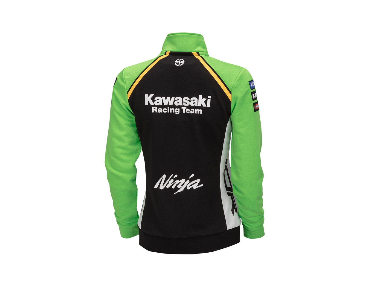 Sweatshirt feminino com zíper nas cores da equipa Kawasaki 2024 WSBK, com bolsos externos com zíper, gola alta e bainha e punhos canelados.