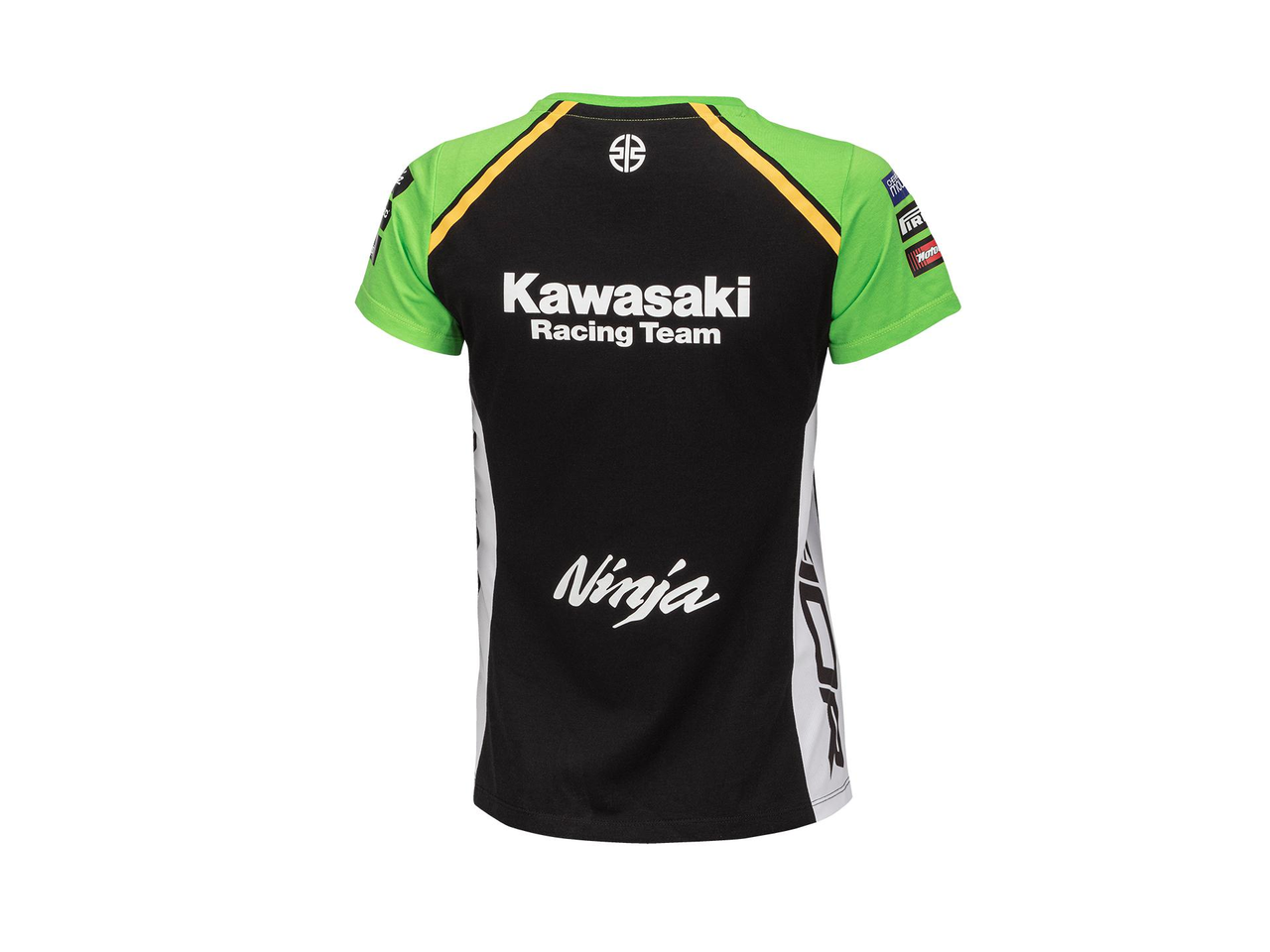 Camisa feminina de manga curta e gola redonda nas cores da equipa Kawasaki 2024 WSBK.