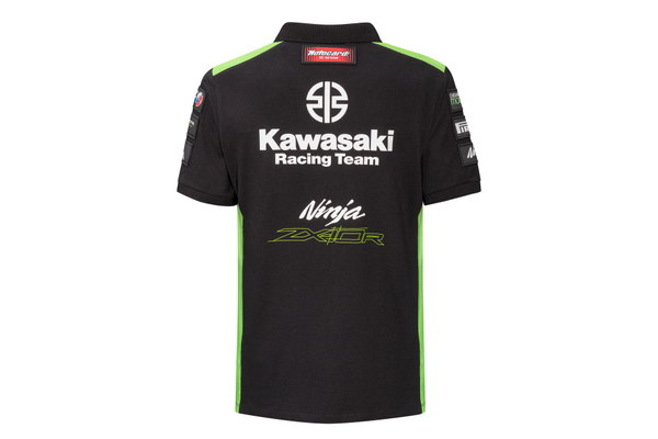 Polo de manga curta da equipa Kawasaki WSBK 2023, com abertura de 3 botões no pescoço e punhos nas mangas.