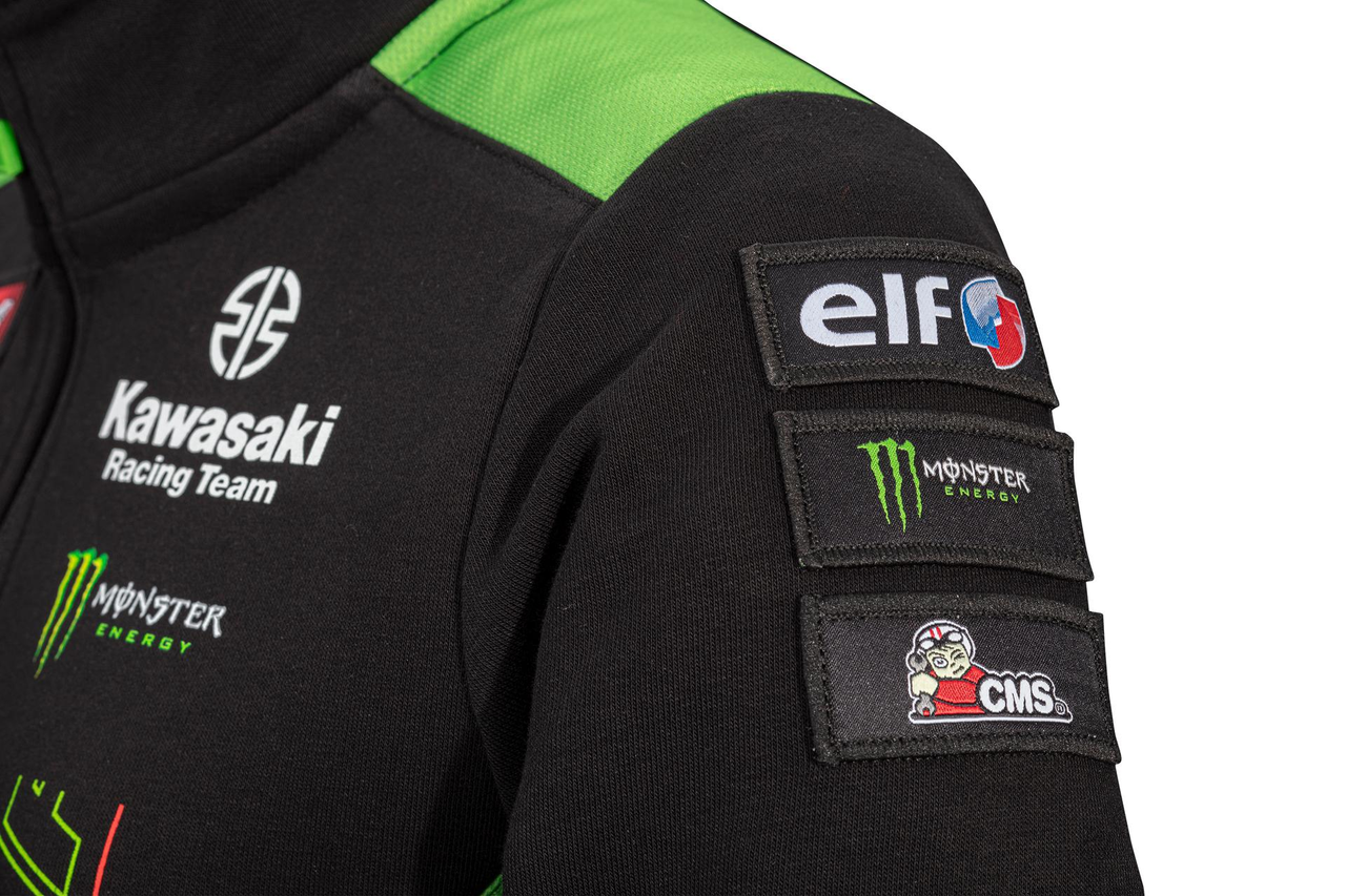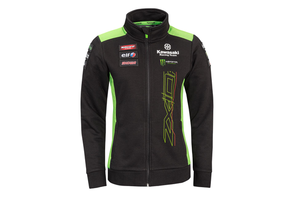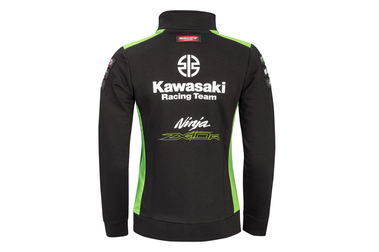Sweatshirt de mulher com fecho nas cores da equipa Kawasaki WSBK 2023, com bolsos exteriores com fecho, gola alta e bainha e punhos canelados.